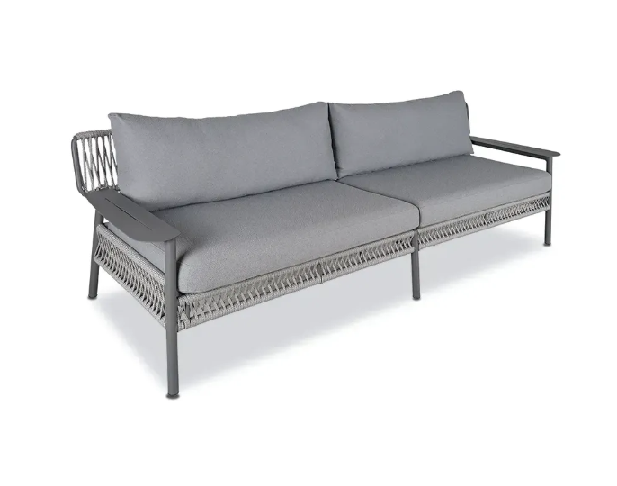 It features a full aluminum structure with electrostatic painting, enhanced by the modern and elegant touch of nautical rope — an invitation to coziness and relaxation.