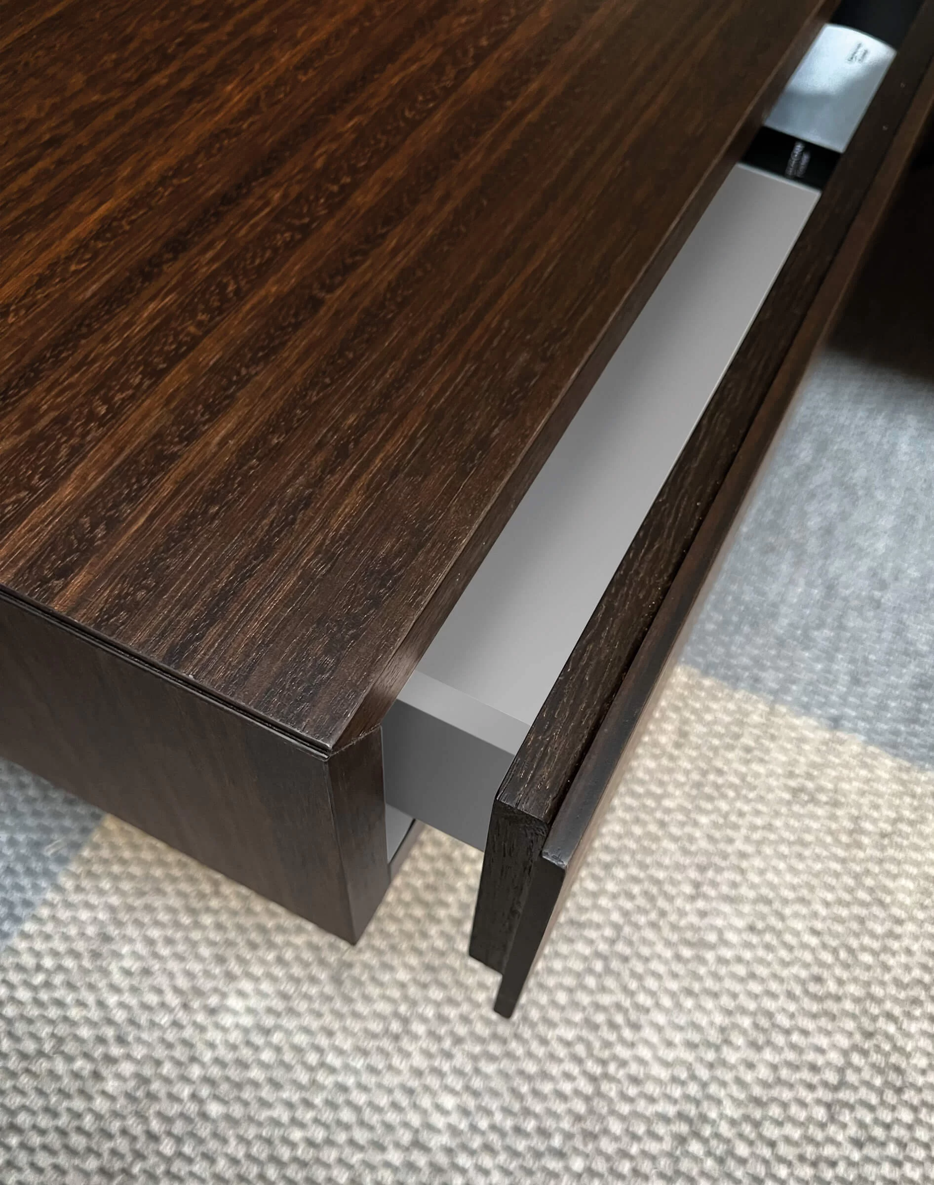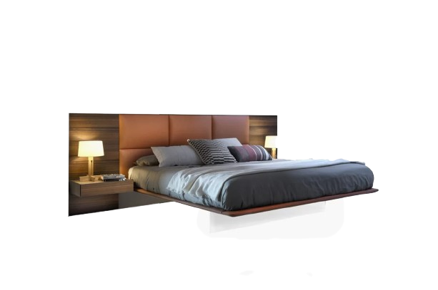 Modern design upholstered bed featuring a wall-mounted, modular headboard. With quilted-effect padding, it can be extended by adding boiserie panels, either plain or with integrated bedside tables. The methacrylate base gives the bed a suspended appearance, while integrated LED lighting enhances its elegant presence.