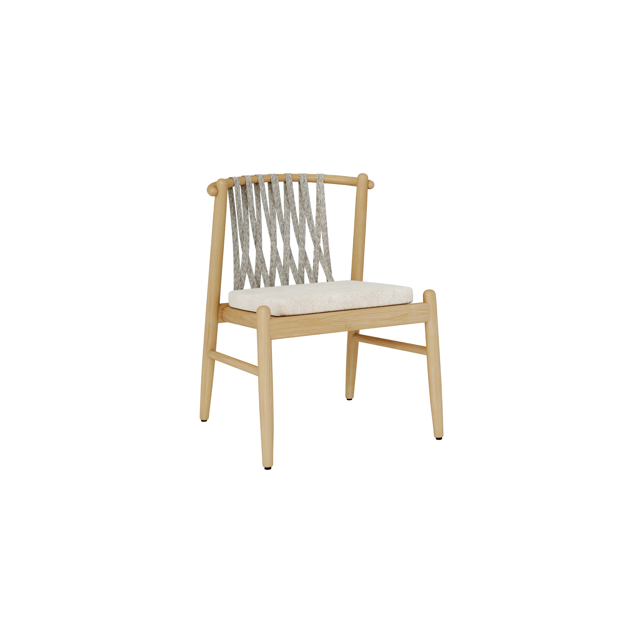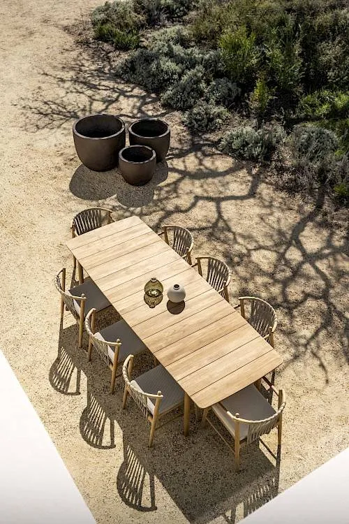 Characterised by its curving, the framework is made of natural teak that pays homage to old craftsmanship. The feeling of being close to nature continues thanks to the hand woven strap with a subtle touch of green. The accompanying cushions of the lounge pieces are made with a maximum of comfort to fully enjoy your relaxation outdoors.