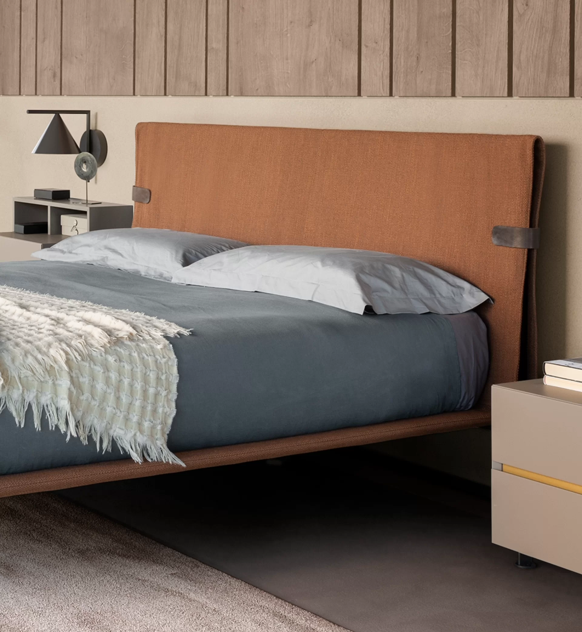More than just a bed, Dress Code is a modular project that offers endless possibilities for customization, thanks to the combination of headboard, bed frame, and feet. The standout feature is the headboard, available in fine fabrics, eco-leather, leather, or Leather, designed to become the focal point of the room. The different bed frame and feet options complete the offering, ensuring solutions that meet every aesthetic and functional need.