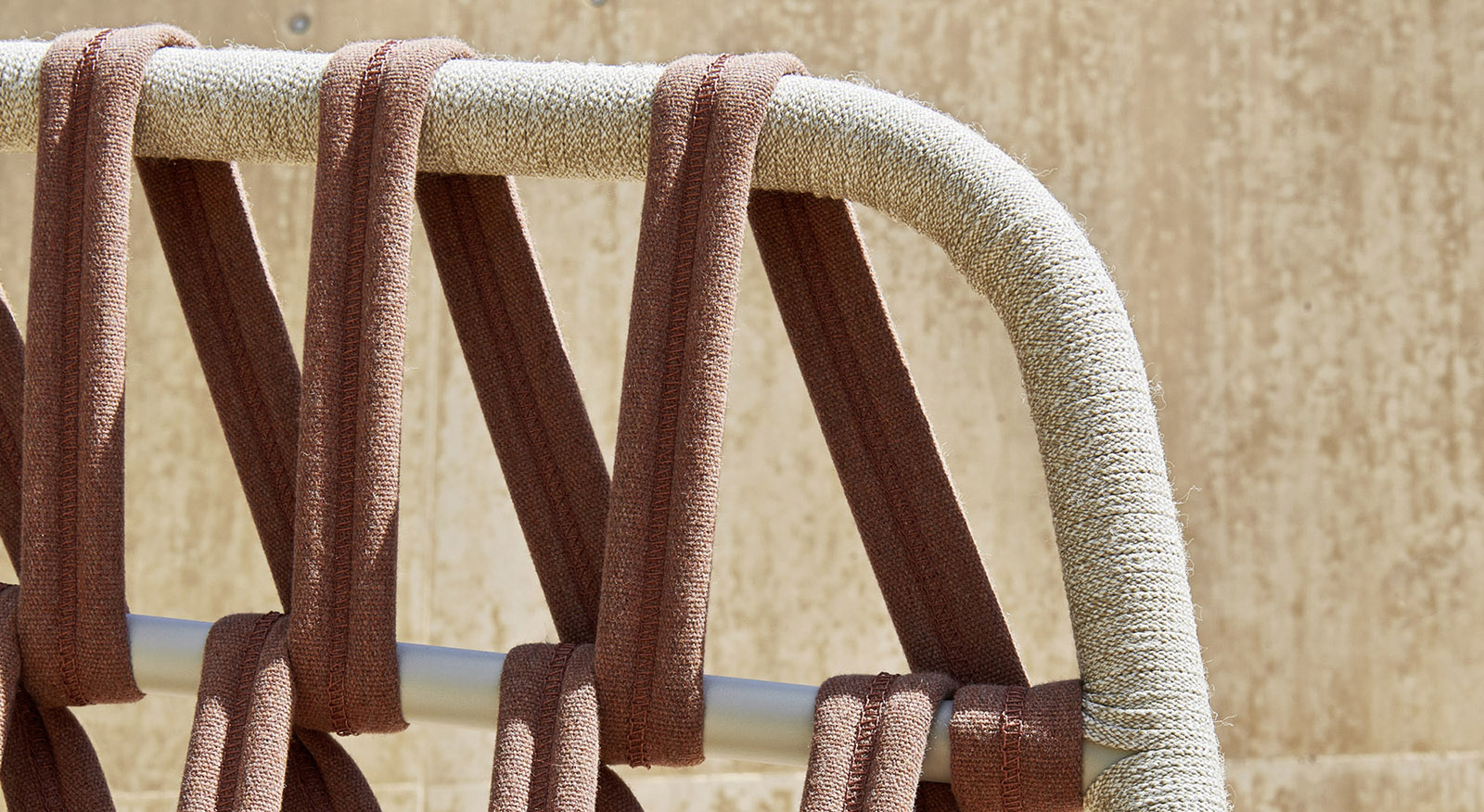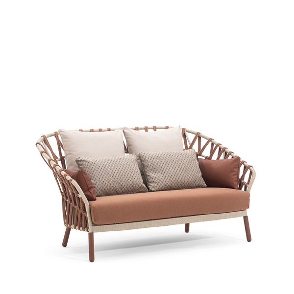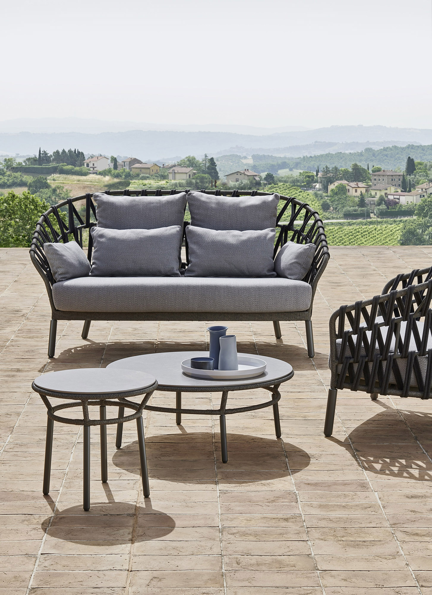 The hand-woven structure, made of acrylic fabric bands, redefines the concept of the sofa with the support of a solid, enveloping aluminum frame with a powder-coated finish, projecting it into a dimension of airy formal lightness, ideal for outdoor spaces. The seat cushion is made of padded fabric with open-cell Dryfeel® foam, suitable for outdoor use. Backrest cushions are included.