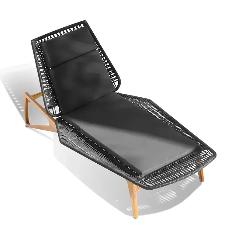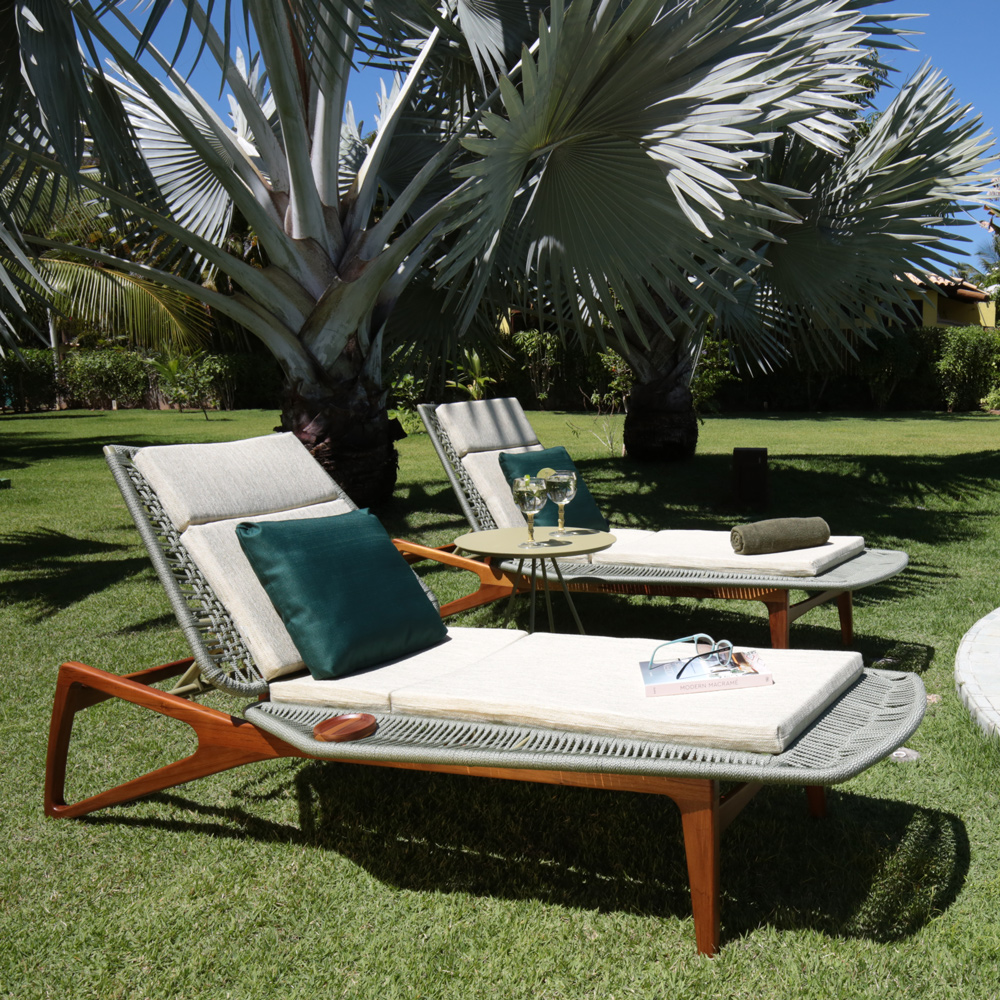 In a symbiosis between the deck and the furniture, the wooden structure with rounded edges and a triangular shape brings lightness and originality to the MARINE lounger, which contrasts with the hexagonal shapes of the nautical rope weaving, creating a mix of materials, textures, and that pleasant feeling of comfort and relaxation.