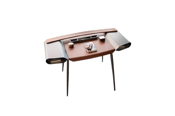 This is a refined and contemporary bureau with a Dark Bronze metal frame that folds elegantly at the sides to offer two practical storage compartments.