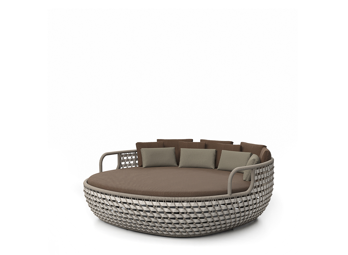 The horizontal braiding, achieved by mixing rope and webbing, provides a unique sinuosity and elegance, dressing the aluminum structure. This detail gives the piece a graphic and marked skin, creating a visually striking design full of character.