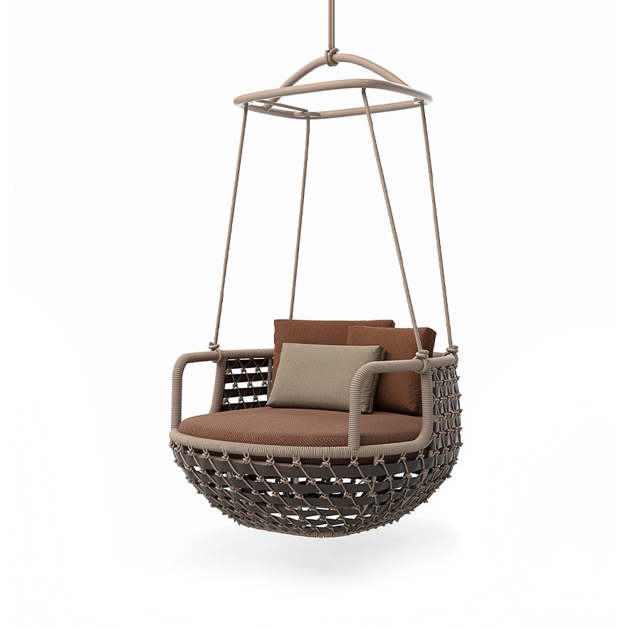 The horizontal braiding, achieved by mixing rope and webbing, provides a unique sinuosity and elegance, dressing the aluminum structure. This detail gives the piece a graphic and marked skin, creating a visually striking design full of character.