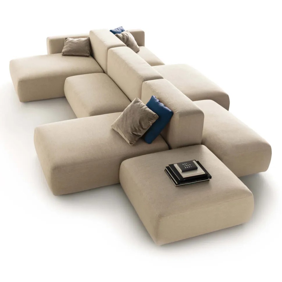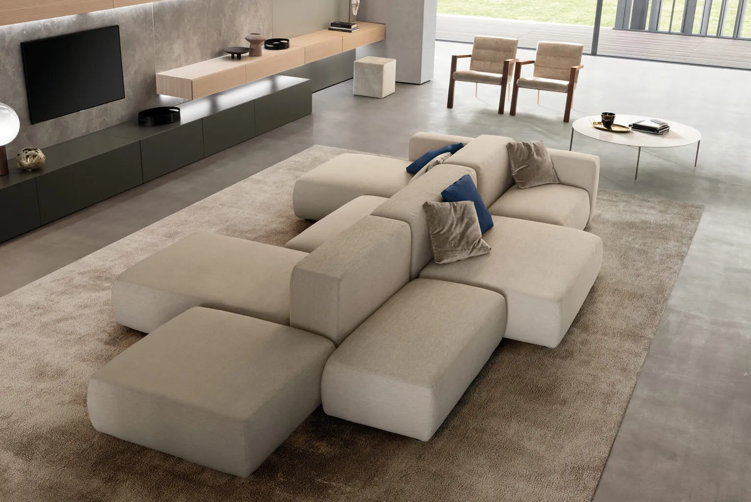 An upholstered sofa with rounded shapes and an eclectic design. The modular design features seats, backrests and armrests in different sizes, ideal for shaping linear, corner or free-standing compositions to fit any space. In each one, the individual elements are fixed together at the bottom by metal clips that ensure maximum stability, and the upholstery can be customised with a variety of removable fabrics and high-quality leathers.