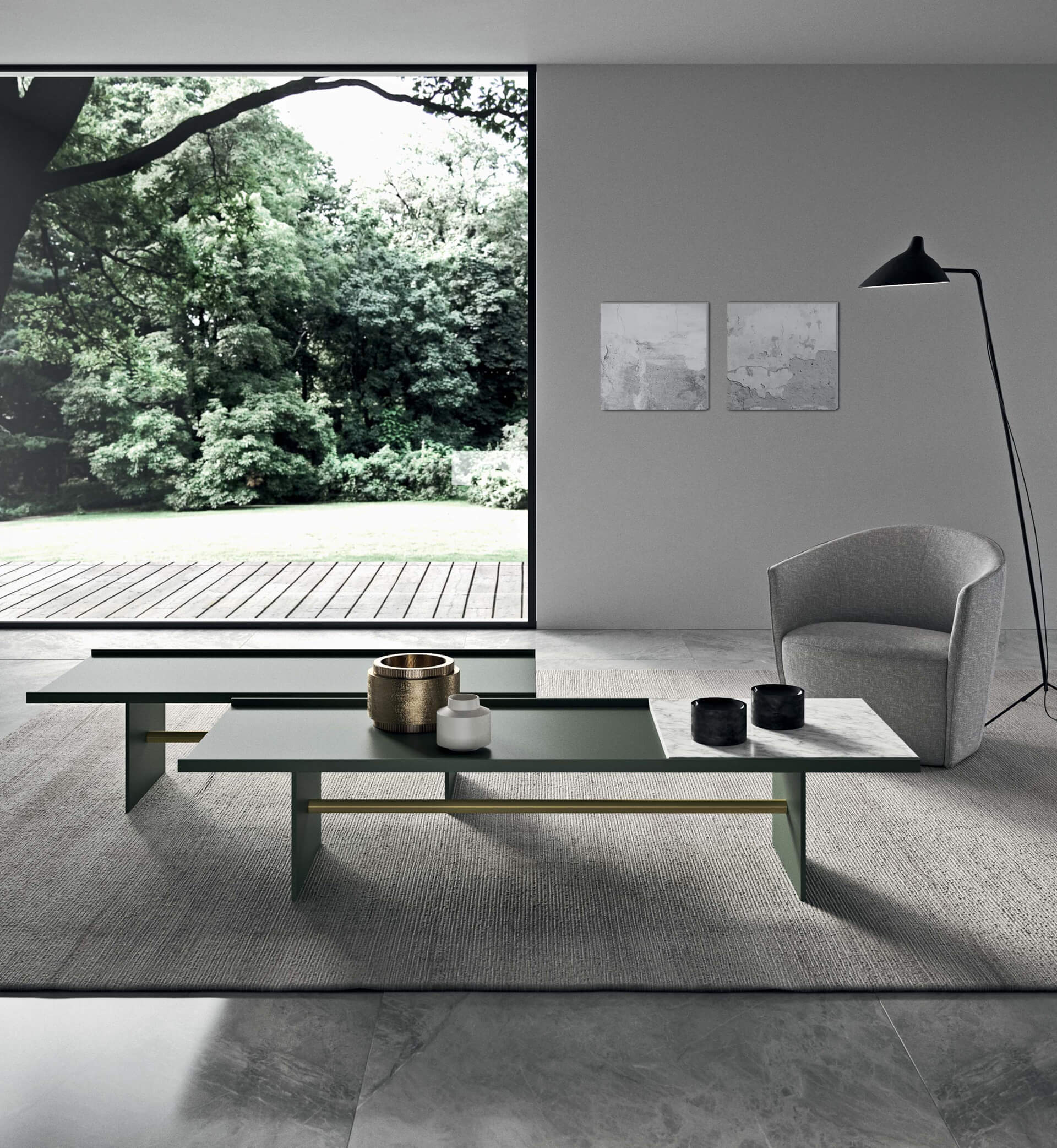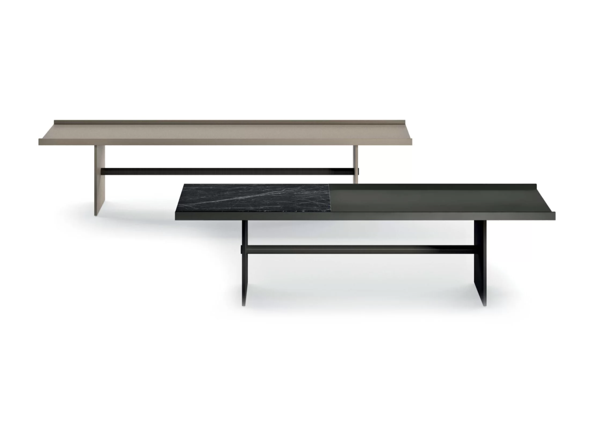 12 mm thick MDF structure and support available in matt lacquer or Metal Standard. Ø 33 mm metal connection crossbar also painted in Metal Standard. Optional top in satin-finish back-lacquered glass and 5 mm thick mirror or in 20 mm marble, bevelled at the top.