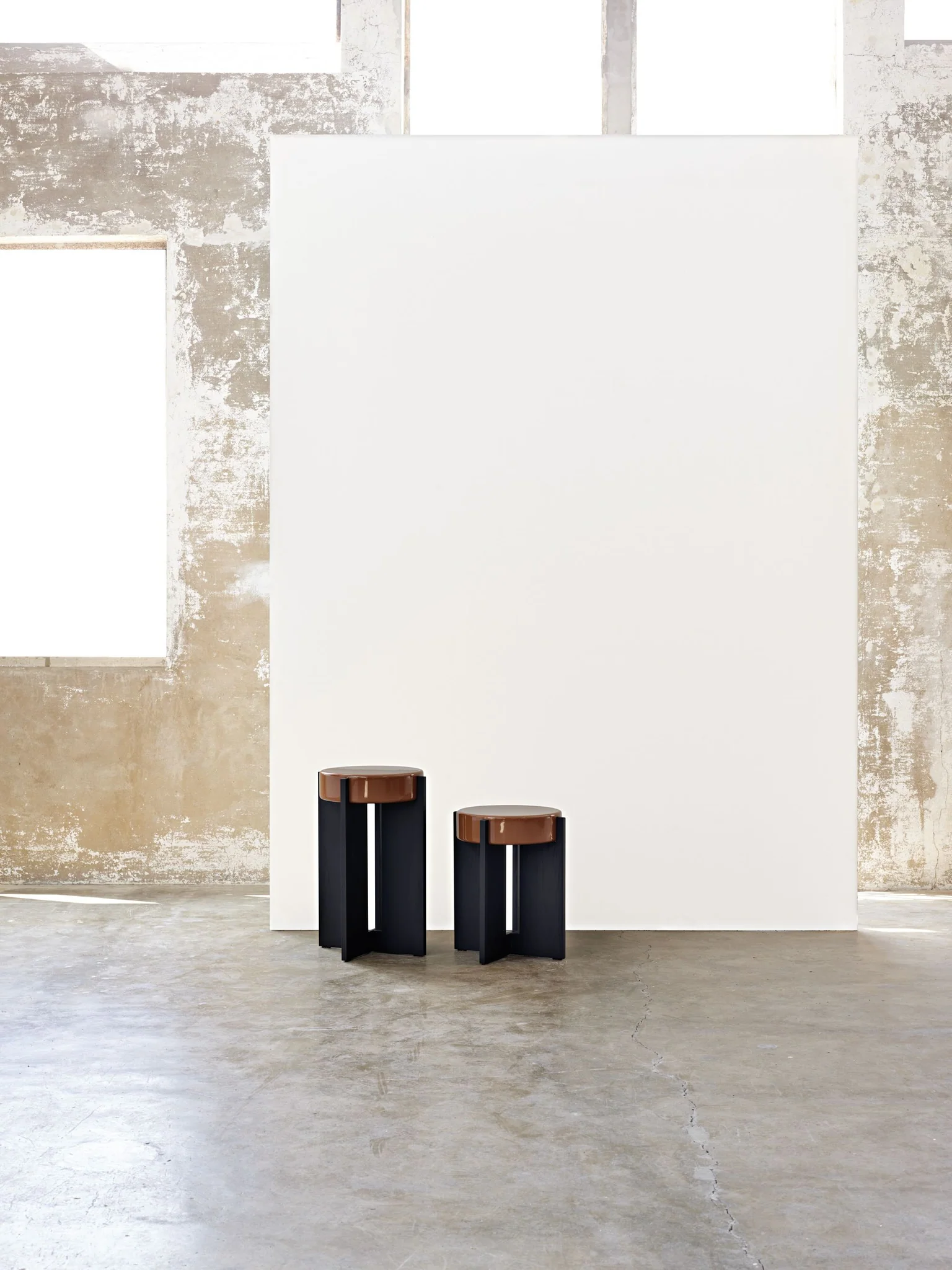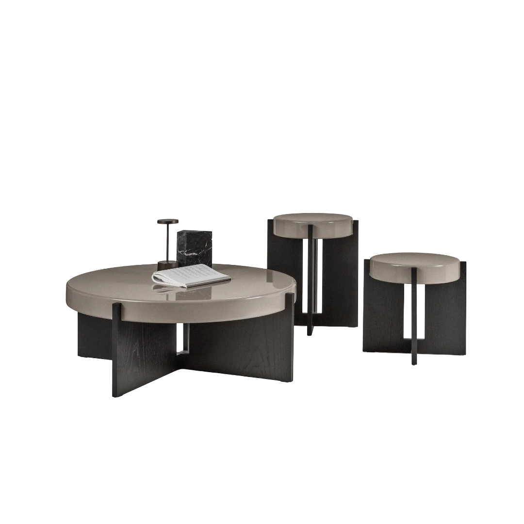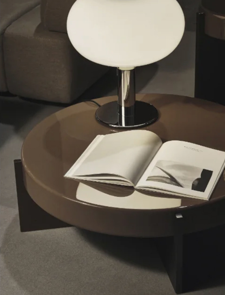 Looking from above, this table resembles a sniper aim, thus the name MIRA («aim» in Portuguese). It is another look at the beautiful and warmingly calm 70s environment and will bring you to a James Bond movie scenario. The thick shiny lacquered top is perfectly placed in a smoked and thin wood frame, creating an interesting contrast which allows for a multiplicity of effects, by changing the color of the lacquer.