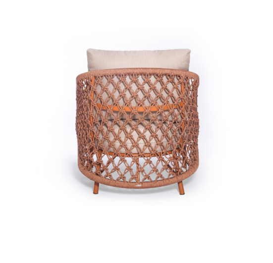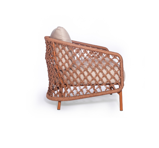 Its structure is made of aluminum tubing with electrostatic painting, and the nautical rope weaving is paired with cushions filled with foam and siliconized fiber, offering exceptional coziness and comfort.
