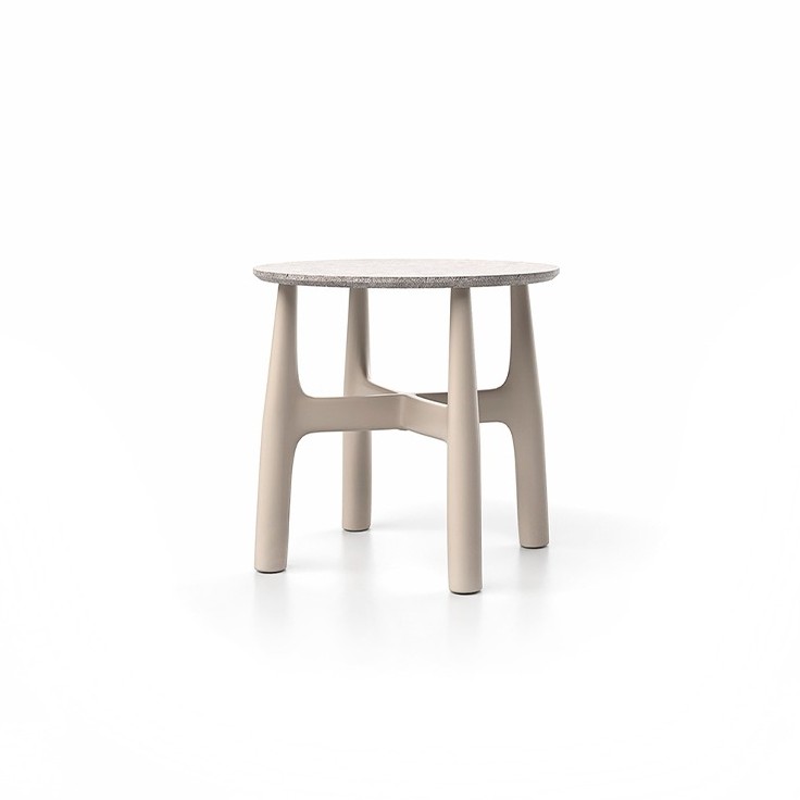 The balance between functionality and character. Its aluminum structure provides lightness and strength, while the Dekton Nebbia Pietra Kode top introduces an elegant and timeless texture.