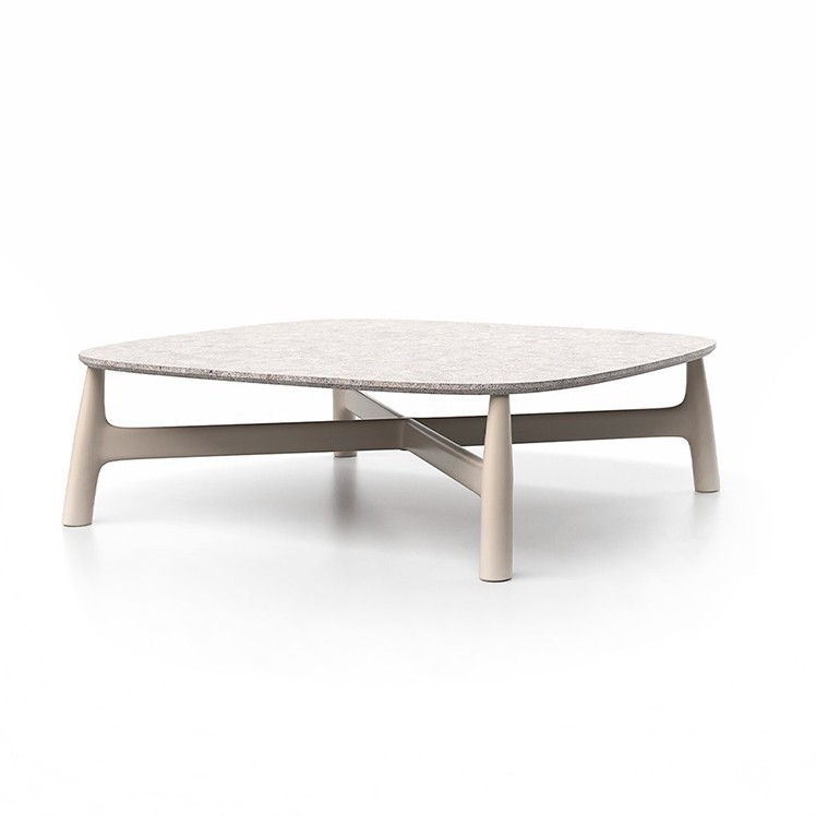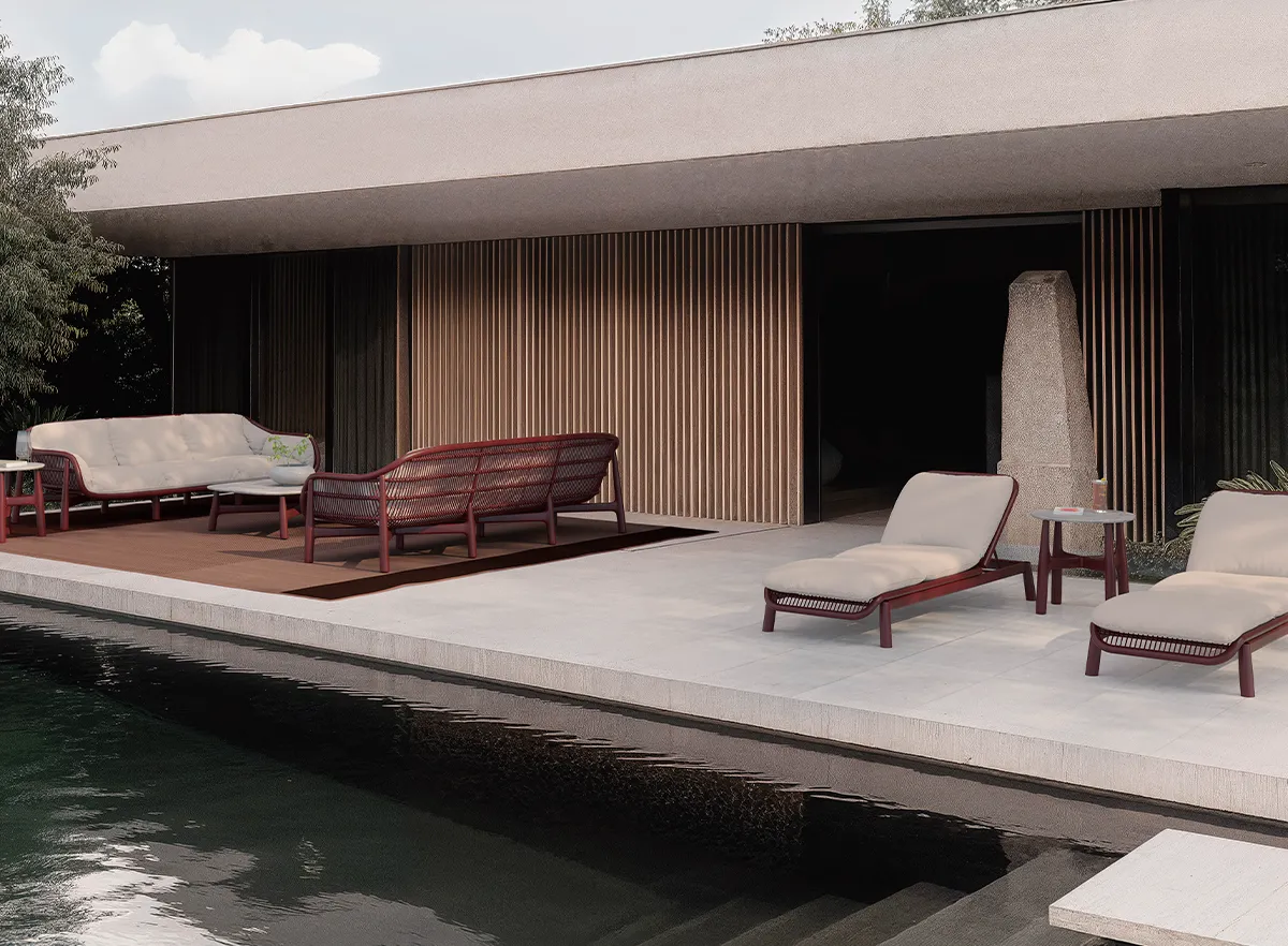 The balance between functionality and character. Its aluminum structure provides lightness and strength, while the Dekton Nebbia Pietra Kode top introduces an elegant and timeless texture.