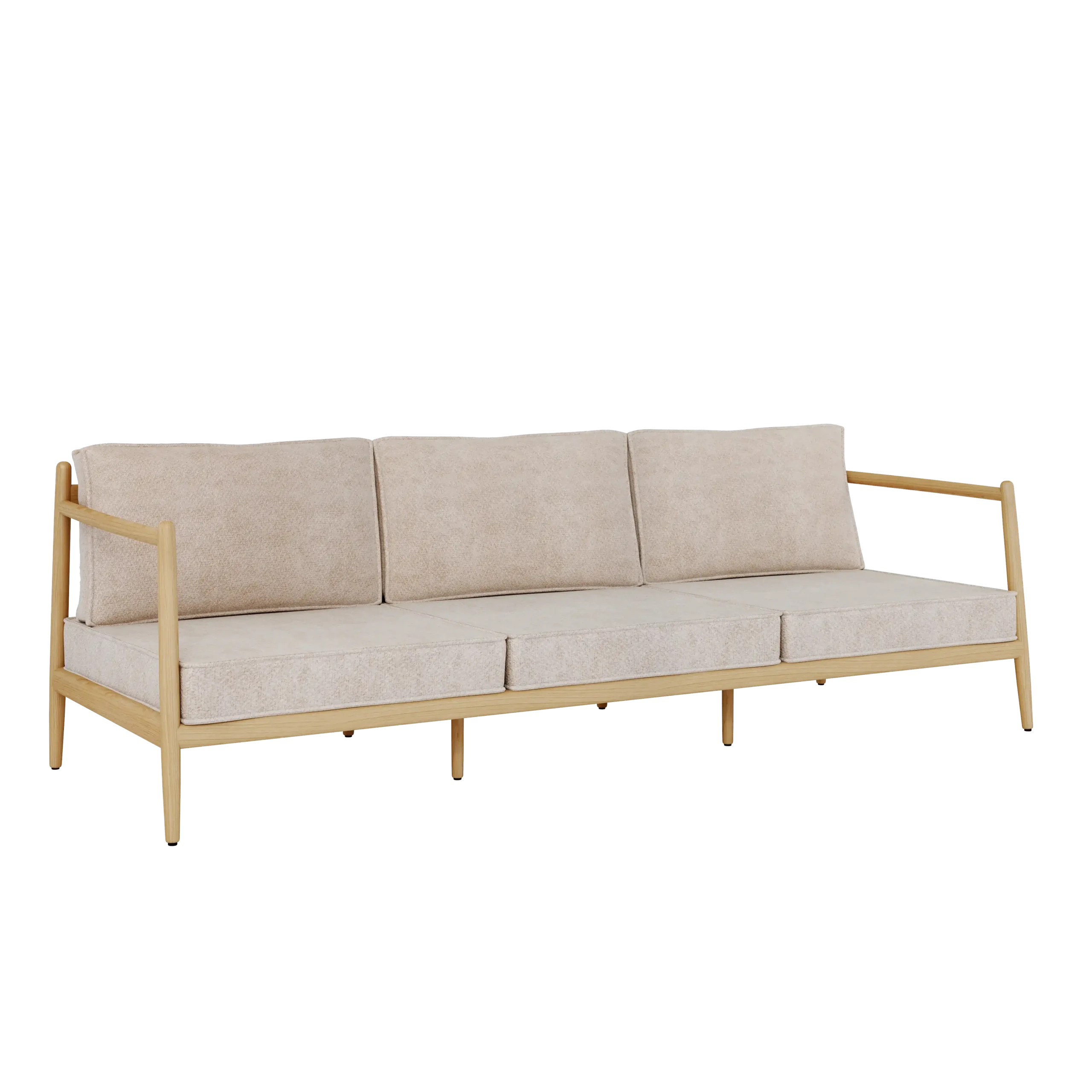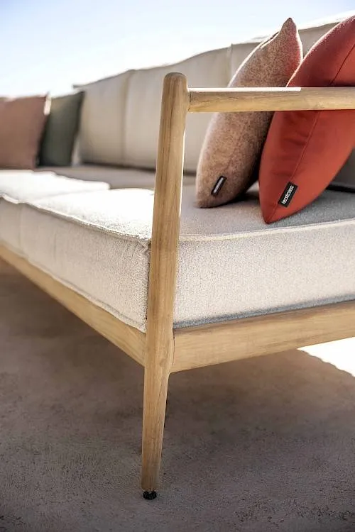Characterised by its curving, the framework is made of natural teak that pay homage to old craftsmanship. The feeling of being close to nature continues thanks to the handwoven strap with a subtle touch of green. The accompanying cushions of the lounge pieces are made with a maximum of comfort to fully enjoy your relaxation outdoors.