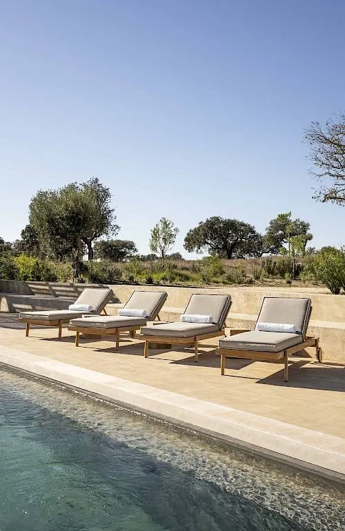Characterised by its curving, the framework is made of natural teak that pay homage to old craftsmanship. The feeling of being close to nature continues thanks to the handwoven strap with a subtle touch of green. The accompanying cushions of the lounge pieces are made with a maximum of comfort to fully enjoy your relaxation outdoors.