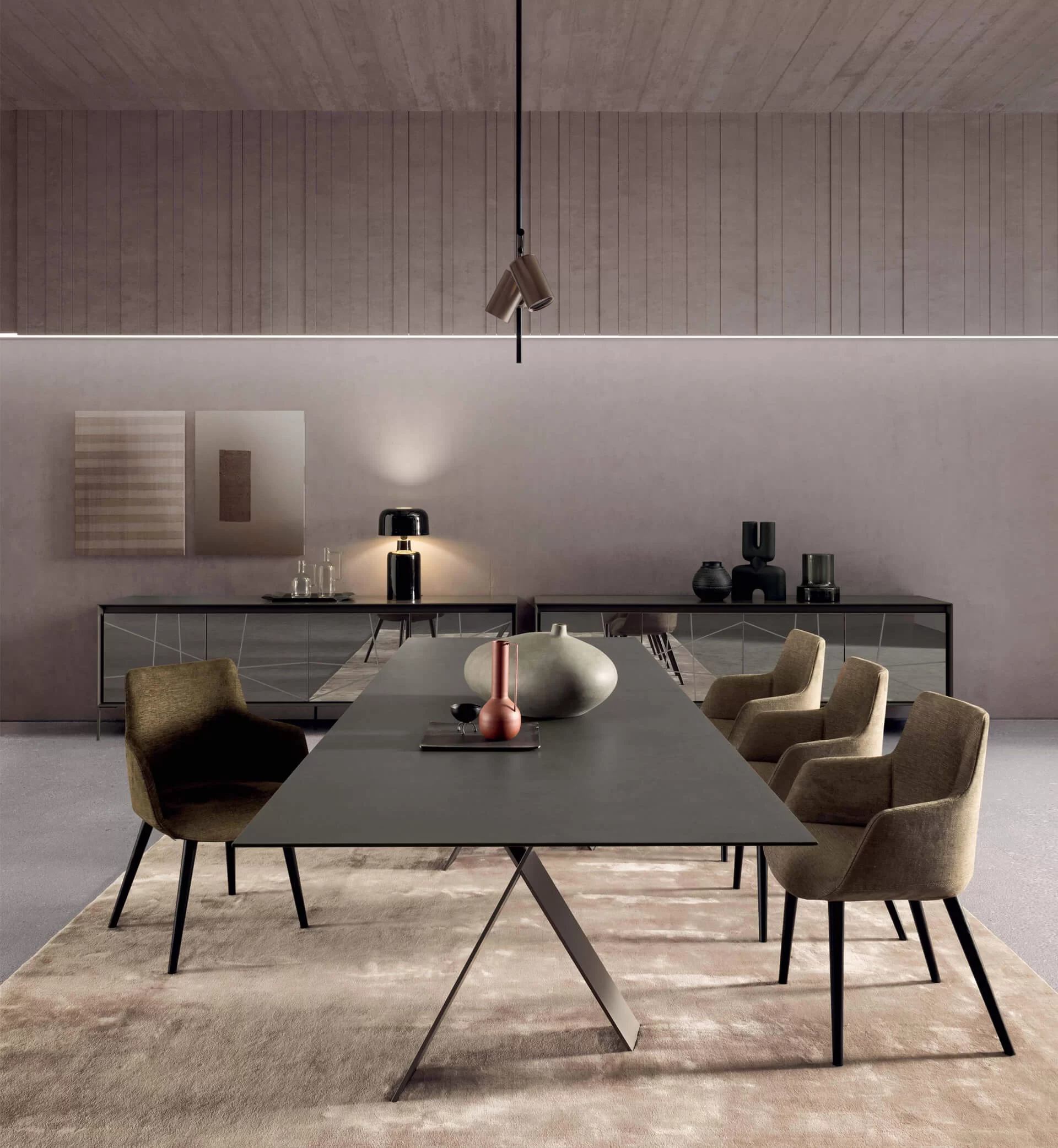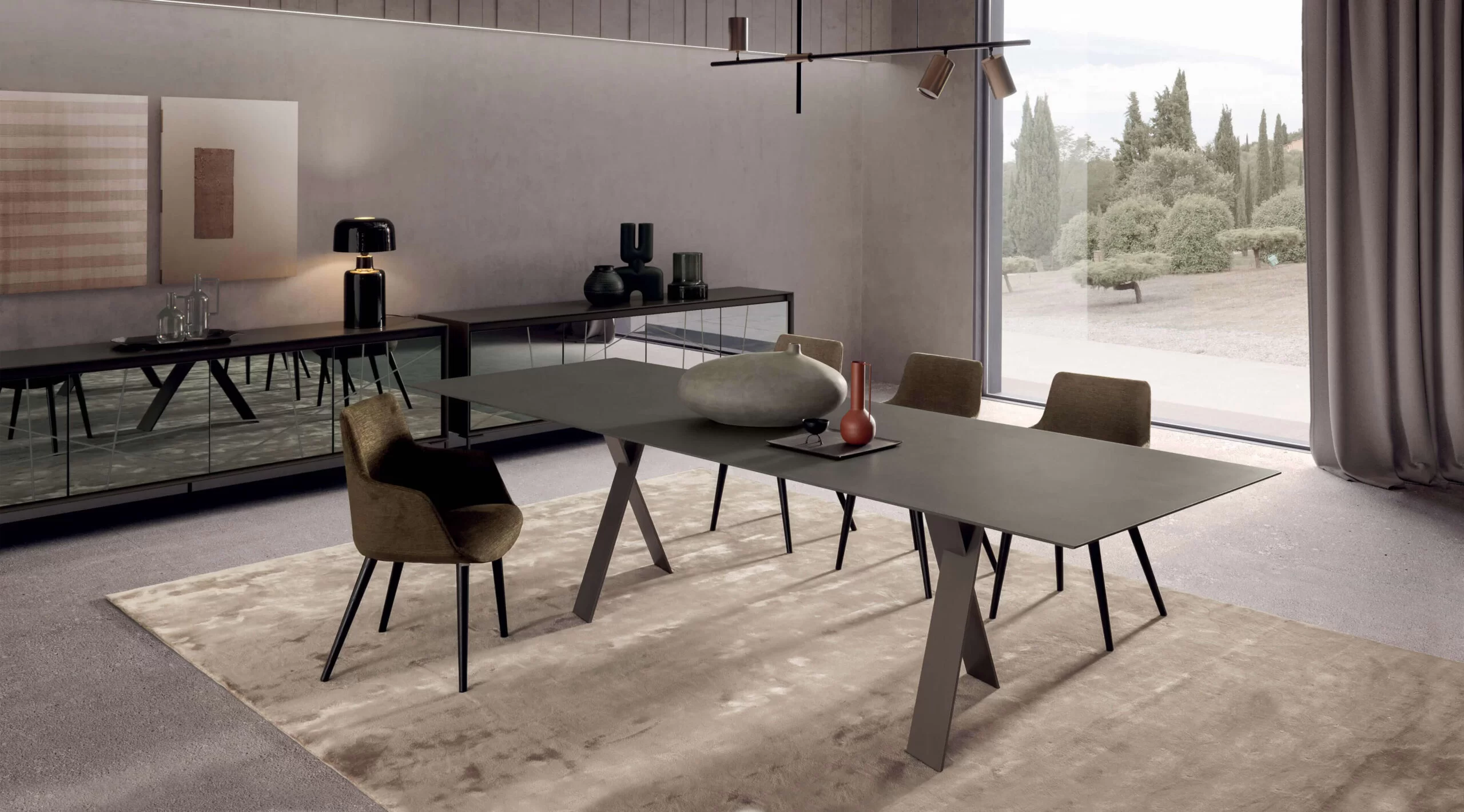 Table with clean lines, structure made of painted metal legs. Perimeter-beveled aluminium undercounter, fixed or extendable table top concealed on both sides.
