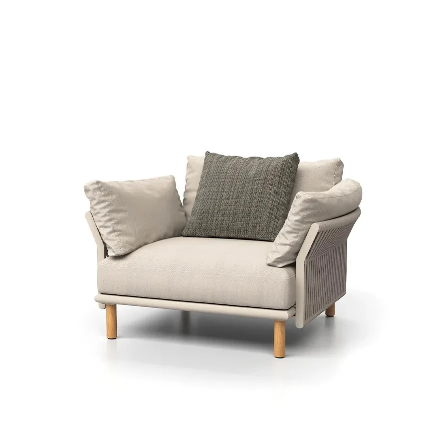 Armchair with aluminum structure finished in a white wash tone, and Atmospher flat rope 16x5mm, ensuring a combination of strength and elegance.