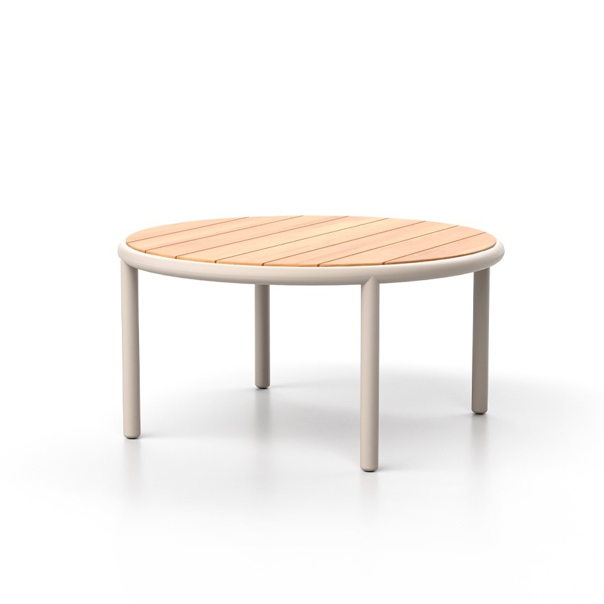 Coffee table that fuses a solid aluminum structure in white wash tone, with a natural teak top, which adds a touch of warmth.