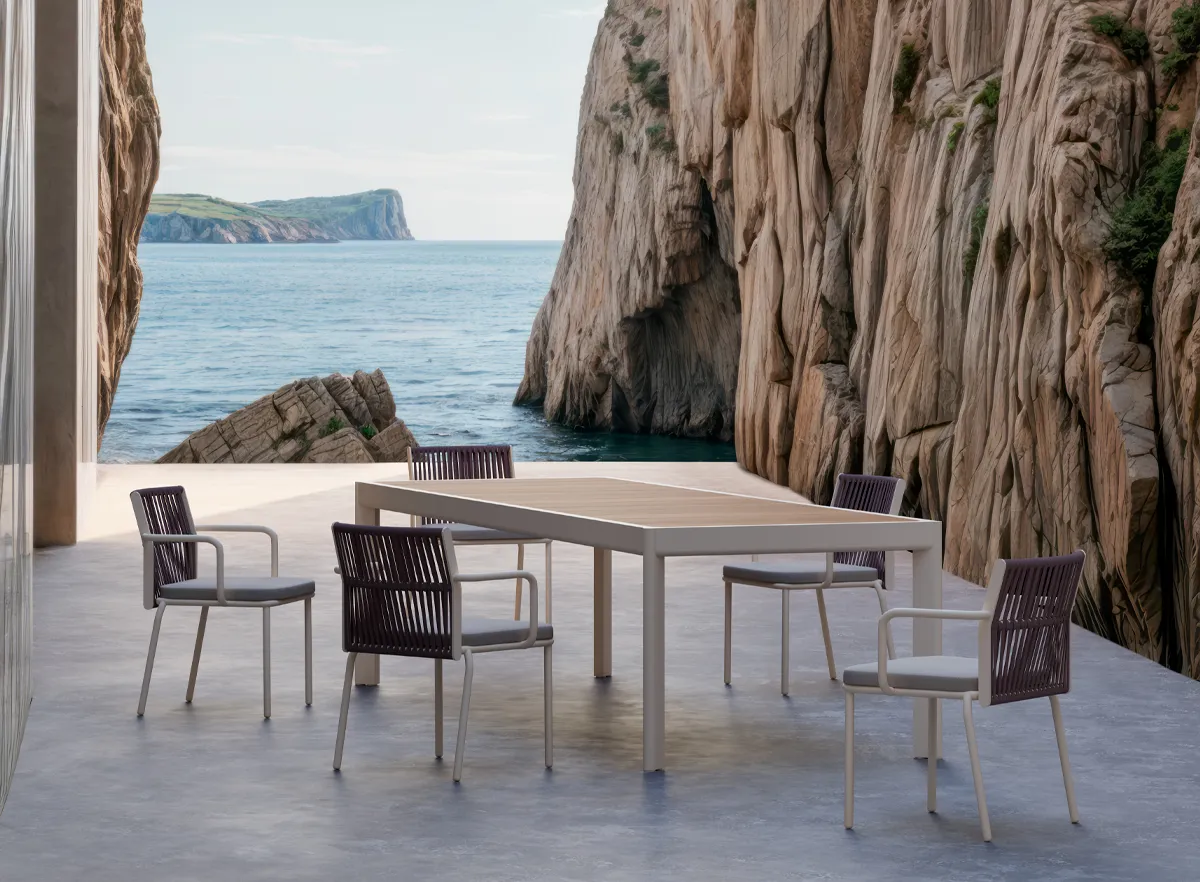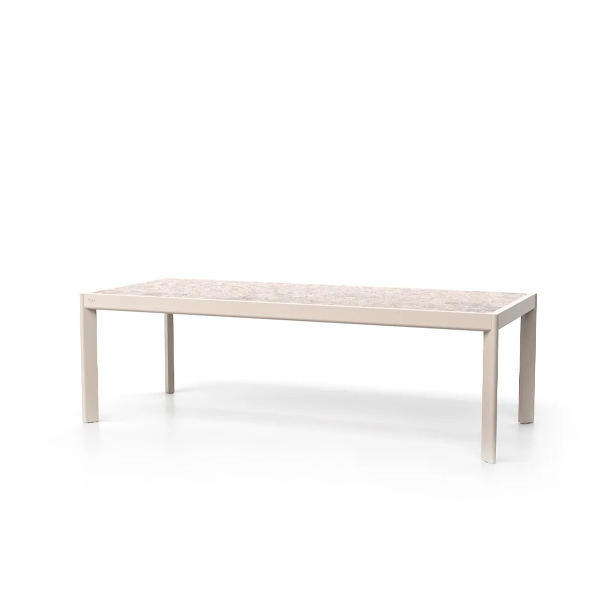 Dining table that fuses a solid aluminum structure in white wash tone, with a Dekton VK03 top, which adds a touch of distinction and elegance.