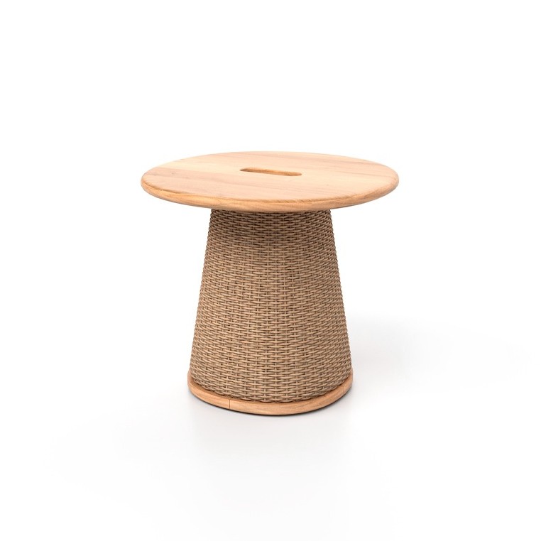 Side table that fuses the naturalness of teak with an elegant 20mm braided banana fiber. This combination offers a unique and sophisticated design, perfect for adding a touch of organic and contemporary style to any living space.