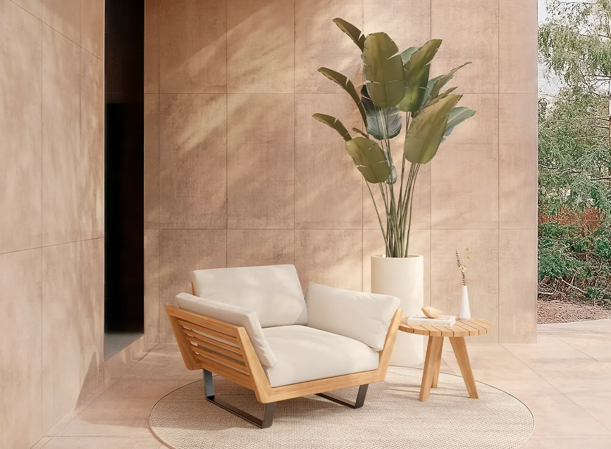 With a natural teak wood structure, resistant and durable, it is characterized by its elegant simplicity, capable of integrating into any outdoor space in a timeless way. With a gesture that evokes naturalness and fluidity.