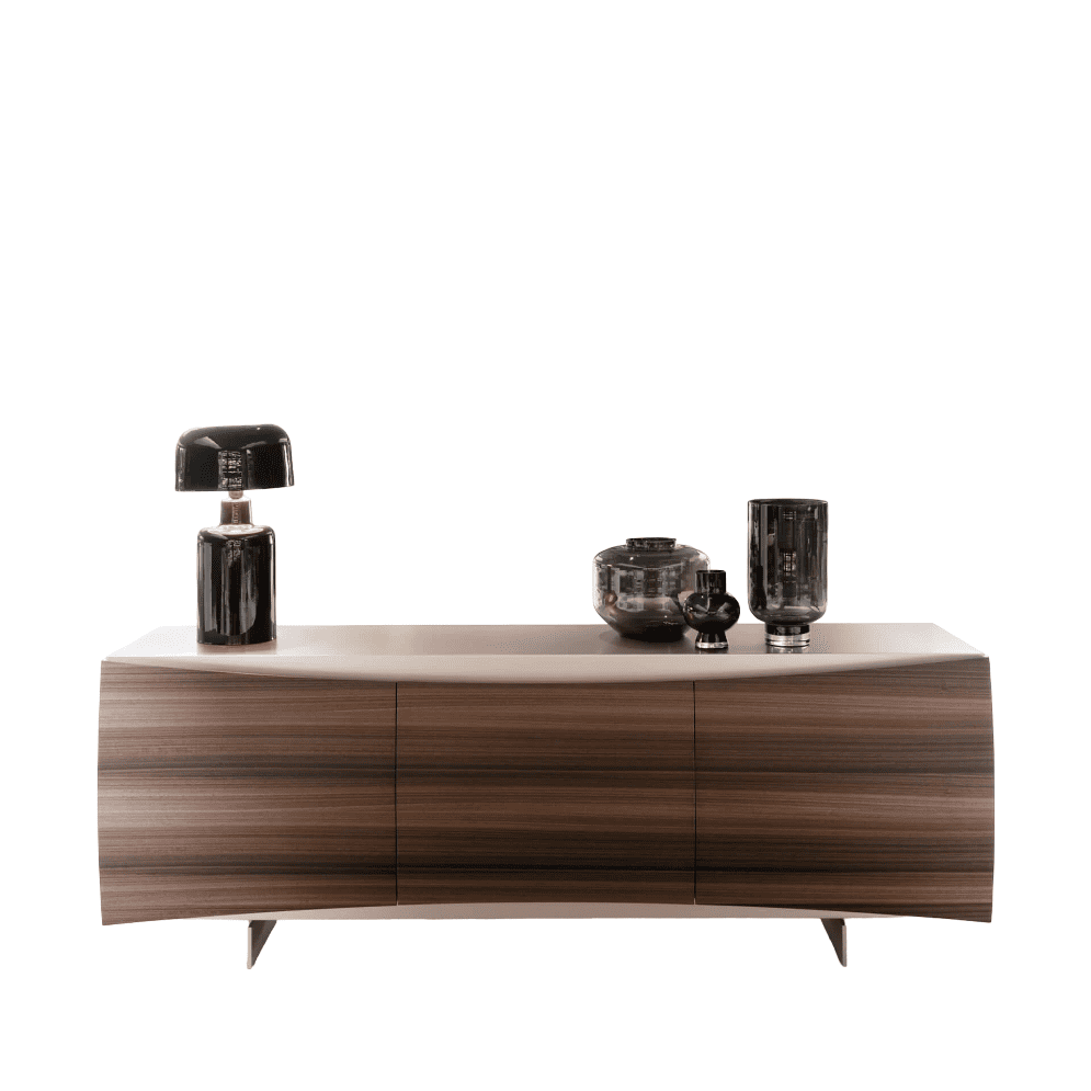 A modern sideboard with customisable fronts in Canaletto Walnut, Eucalyptus or Sepia Oak wood. Curved lines shape the design of the furniture, giving form to the fronts, with the central one defining a capacious storage compartment that conceals a drawer with a cutlery holder inside. The possibility of integrating an under-top lighting system, meanwhile, offers a touch of elegance and practicality.